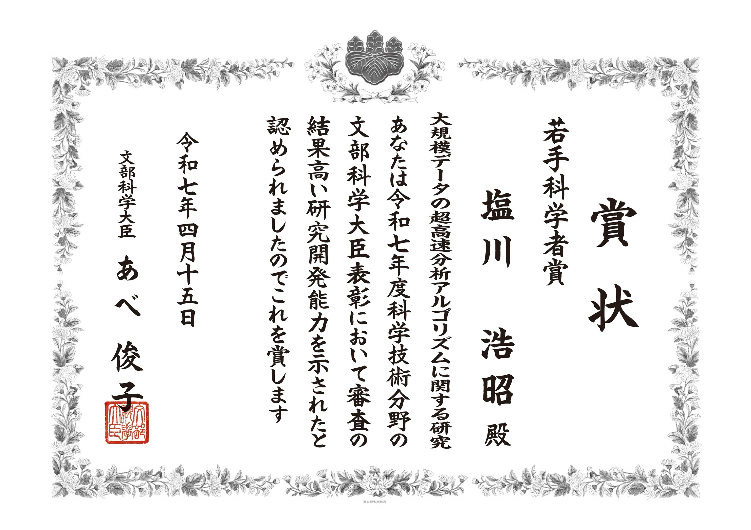 塩川准教授が文部科学省 令和7年度科学技術分野の文部科学大臣表彰 若手科学者賞 を受賞しました.